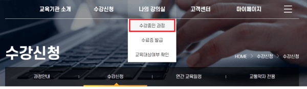 회원 가입을 완료했으면 수강신청을 합니다. 홈페이지 상단 메인 메뉴에 있는 '수강신청'을 누르고 아래 나오는 리스트 중에서 또 '수강신청'을 누릅니다.