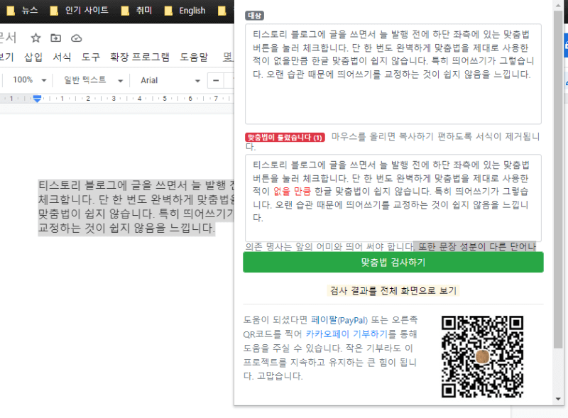 앞서 소개한 두 띄어쓰기 검사기와 달리 크롬 웹브라우저에 플러그인 형태로 사용 가능한 한국어 맞춤법 검사기가 있습니다. 특정 사이트에 들어가서 검사기를 쓰는 것이 아니라 크롬을 이용하는 중에 바로 띄어쓰기 검사를 할 수 있다는 장점이 있습니다.