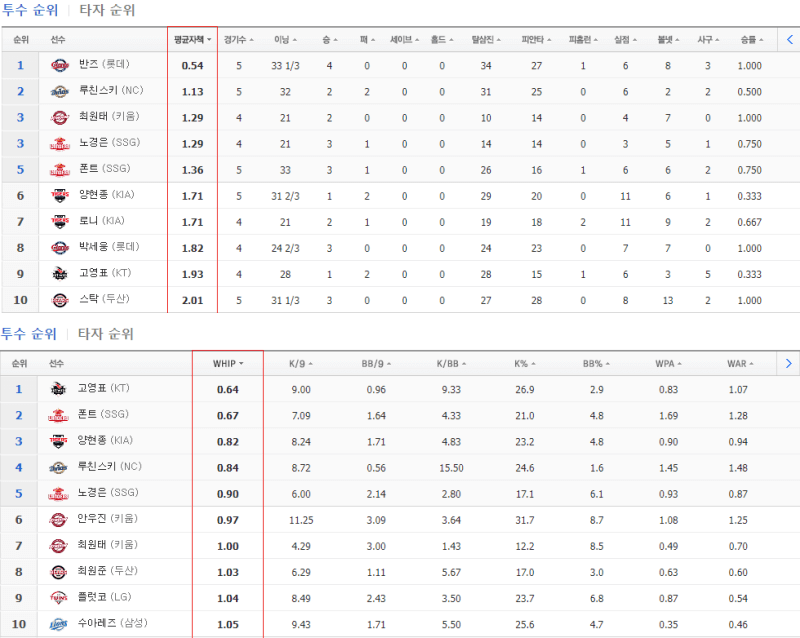 야구를 좋아하는 팬도 정확히 모르는 내용에 대해 정리하며 투수의 세이브와 홀드 조건을 포스팅한 적이 있습니다. 투수의 기록 중 WHIP은 무엇이고 어떻게 계산되는지 알아보겠습니다. 먼저 2022년 4월 26일 기준 아래 두 개의 표를 보겠습니다.