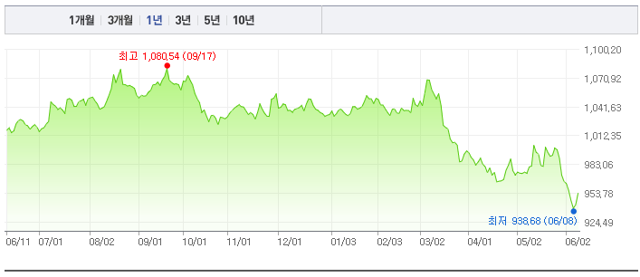 얼마 전부터 엔화가 천 원 이하로 떨어지더니 6월 10일 기준 (하나은행 고시회차 414회) 953.55원으로 마감했습니다. 6월 8일에는 938.68원이었는데 조금 오른 상황이지만 여전히 싸게 느껴집니다. 아래는 최근 1개월간 일본 환율 그래프입니다.