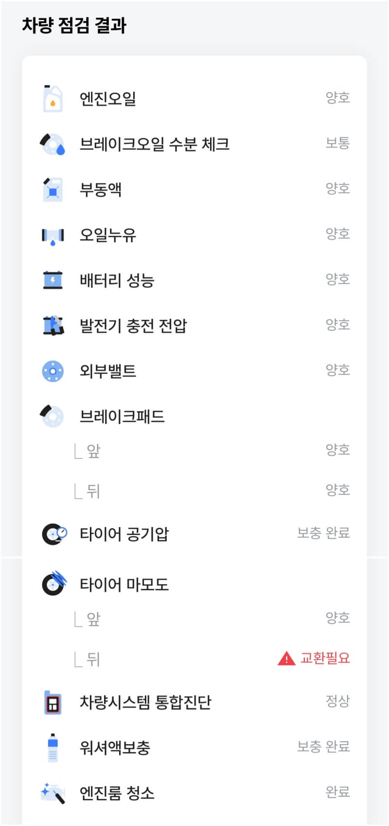 엔진오일 교체뿐 아니라 차량의 전반적인 점검까지 진행되며 그 내용들을 앱에서 확인할 수 있다는 점이 가장 마음에 들었습니다. 점검 후 리포트 내용은 앱에서 확인할 수 있으면 캡처한 사진을 아래 올렸습니다.
