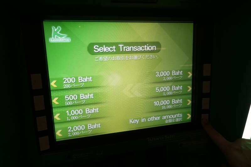 | 1. 카드를 투입 2. 비밀번호 입력 3. 태국어에서 영어로 변경 4. 현금 인출 (Cash Withdraw) 선택 5. 원하는 금액 선택 or 금액 입력 6. Accept 승인 누르고 현금과 영수증 받기 7. 돈과 카드 꼭 챙기기 |